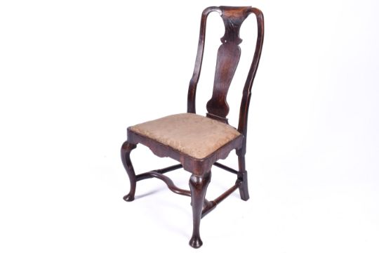 George I walnut high back side chair. Having drop in seat, vasiform back splat and cabriole front supports with pad feet united by a carved shaped stretcher. H104cm x W56cm x D57cm