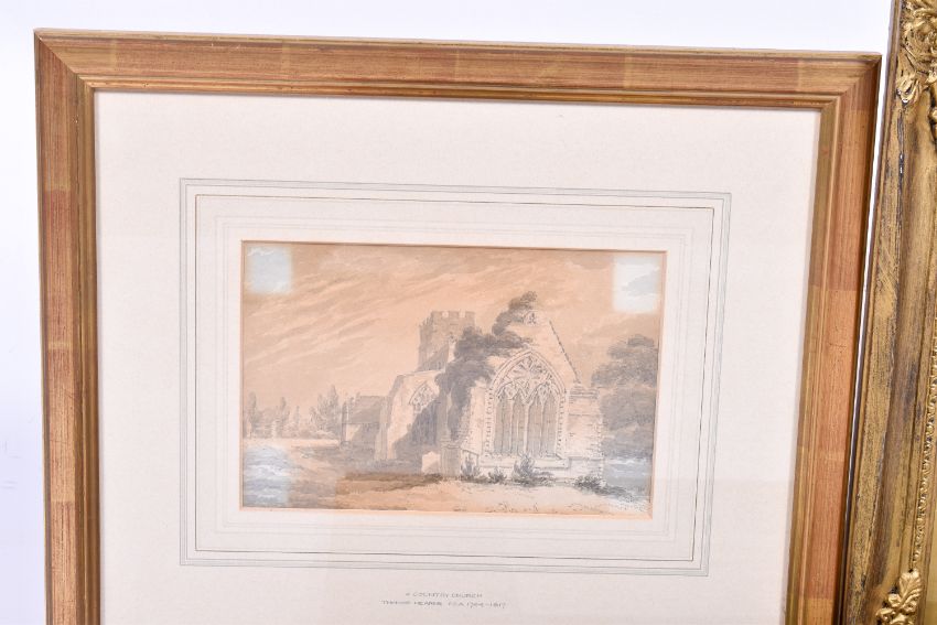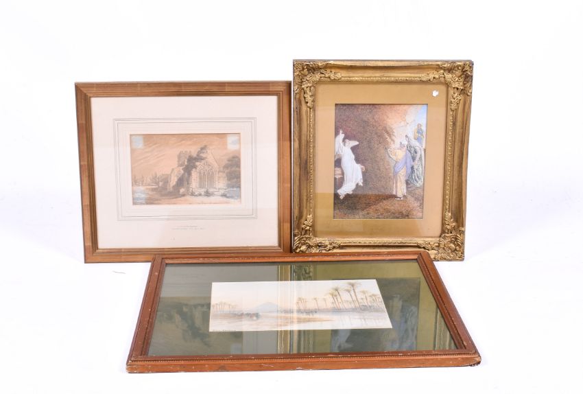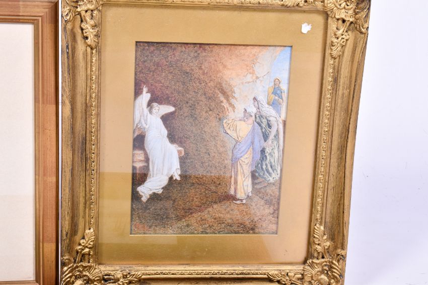 Three framed watercolours pictures. Including C. J. Harty (1889-1951) - The Resurrection, signed lower left, 16cm x 22cm, framed and glazed, 32cm x 37cm, etc.