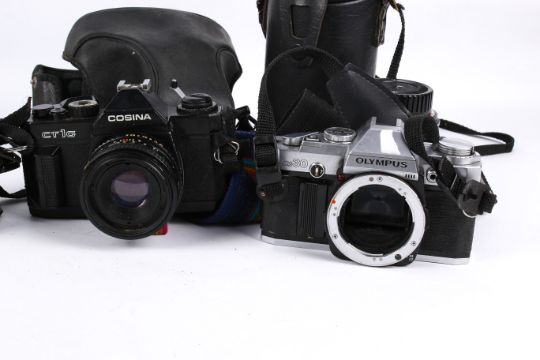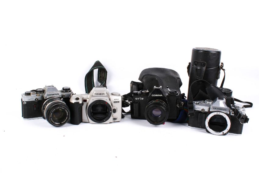 A group of assorted 35mm film cameras and lenses. Including Olympus OM10 and OM30, etc.