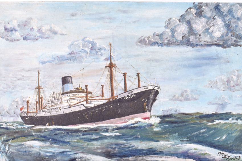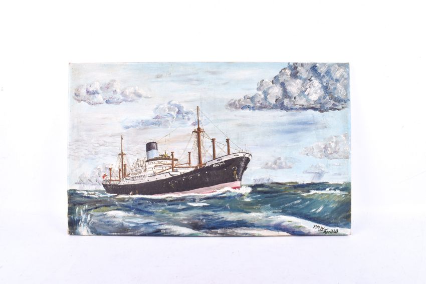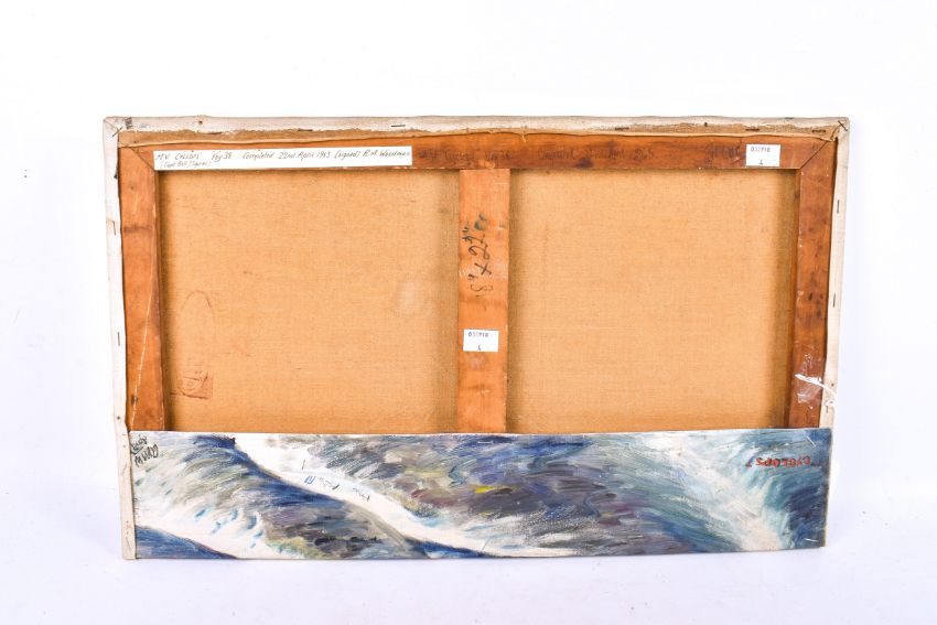 R M Woodman (20th century) - M V Cyclops - oil on canvas, 1963. Signed and dated lower right, has been cut down, label verso, 56cm x 34cm