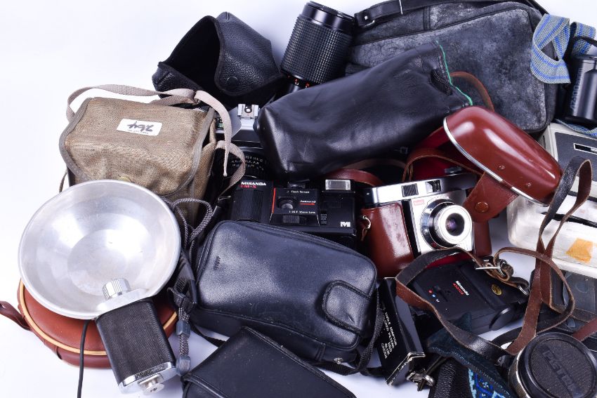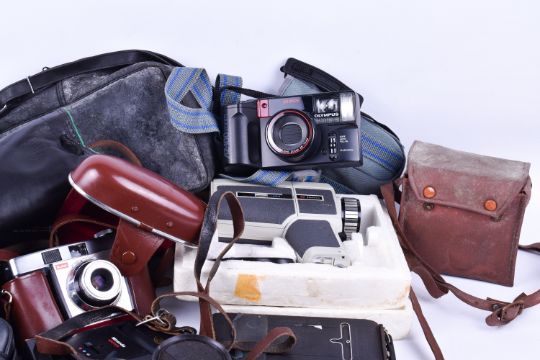 A collection of vintage 35mm film cameras including Pentax,Olympus and Petri. Two Kodak Brownie cameras and Colorsnap. Plus a Halina super 8 film camera and a Kestrel zoom lens.