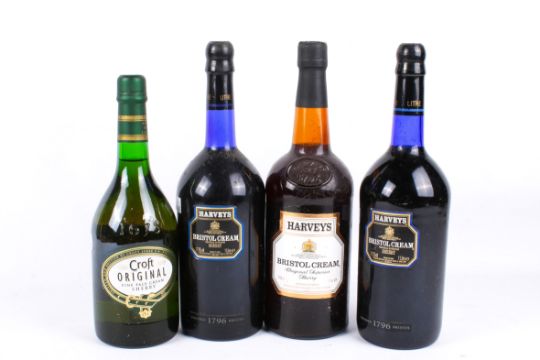 Four bottles of assorted sherry. Including Harvey's Bristol Cream each 1L and Croft Original 75cl