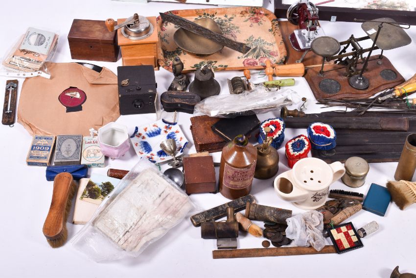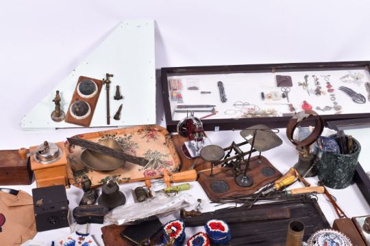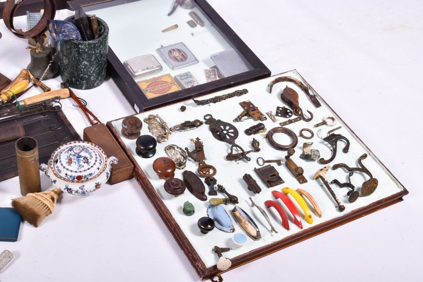 A collection of bygones and household items.Including displays of hooks, handles, cigarette cases and pens. Largest W93cm x H34cm