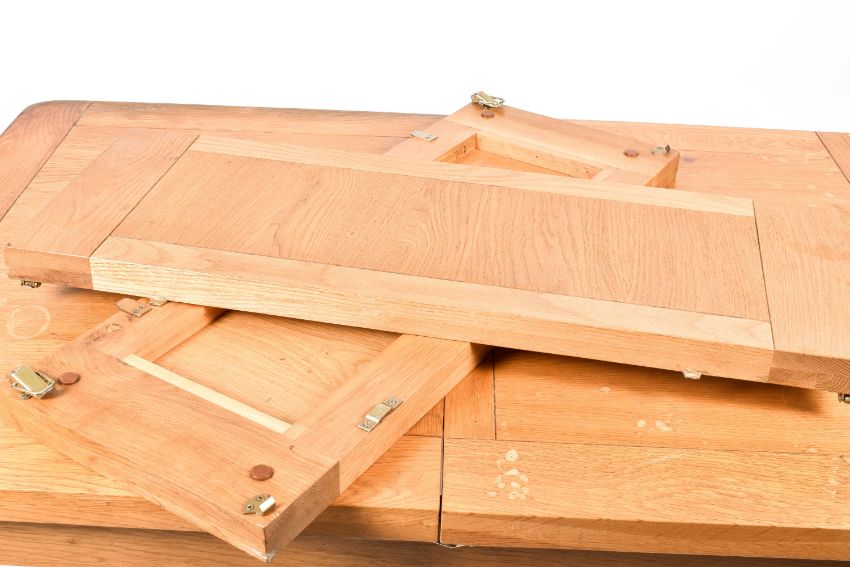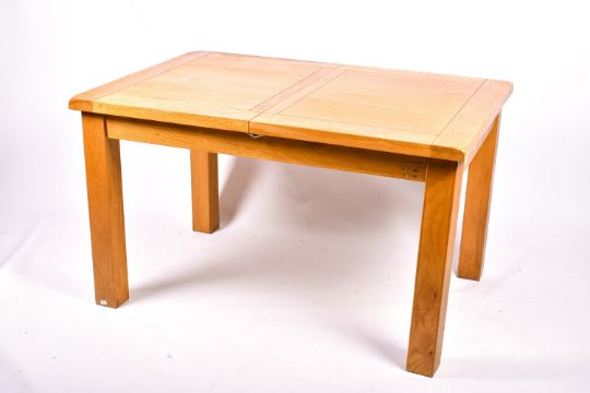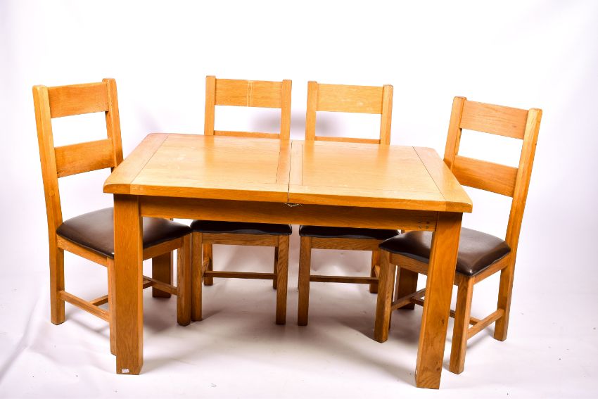 A contemporary light oak extendable dining table and set of four matching chairs. The rectangular table raised on black supports, with two additional leafs, H78.5cm x W134cm (closed) x D90cm. The chairs upholstered with brown leather seats, raised on square supports united by 'H' stretchers, H104.5cm.