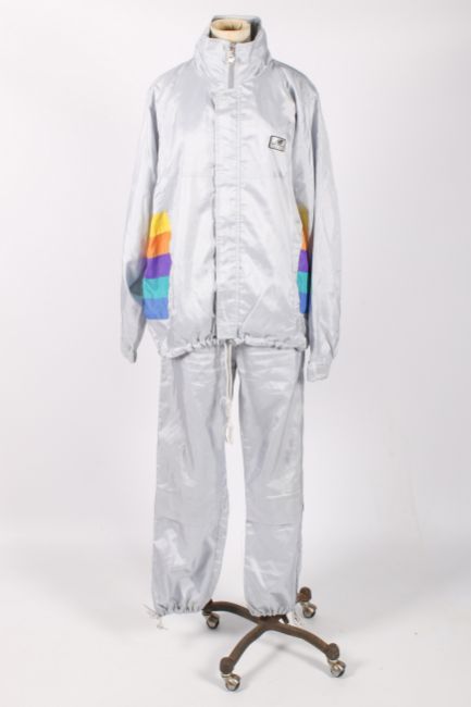 A vintage Retro New Balance tracksuit. Constructed of light blue polyester with rainbow accents, jacket L69cm, trousers L100cm.