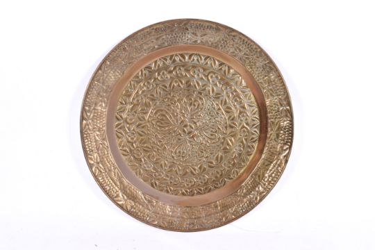 A very large circular embossed brass charger. Having embossed geometric designs. Diameter 90cm