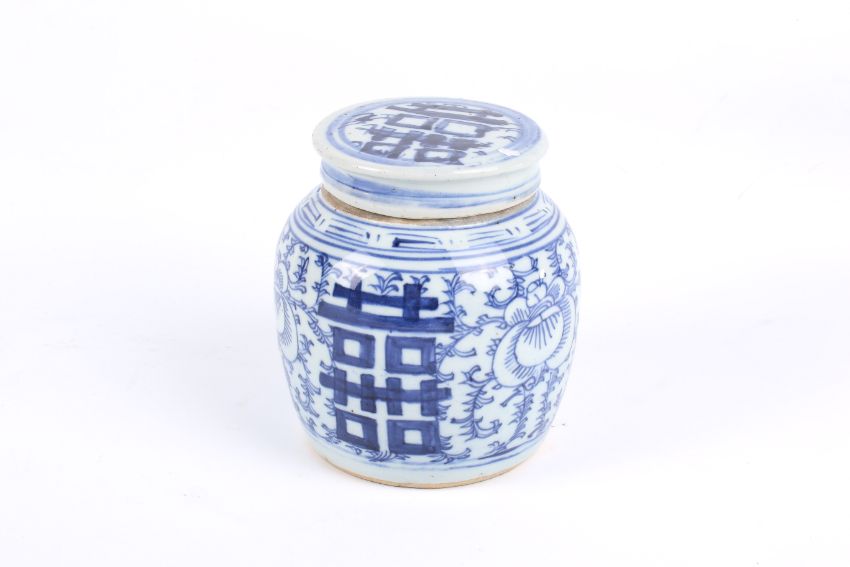 A 20th century Chinese blue and white ginger jar and cover. Having 'Double Happiness' character mark. H15cm