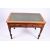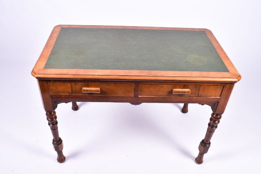 A late Victorian early 20th century mahogany writing table or desk. With green inset leather top, two drawers and turned supports. H76cm x W106cm x D60cm