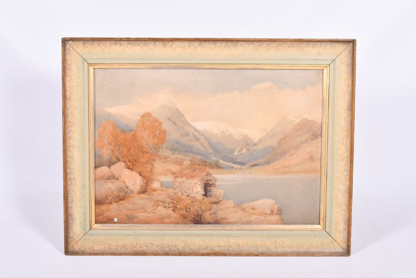 Edward A Leonard (British, ARWA). Watercolour. Depicting Fjaerland Fiord, Norway with snow capped mountains in the distance, signed lower left with artist and subject details to verso. 65cm x 44cm. Framed and glazed 82cm x 62cm