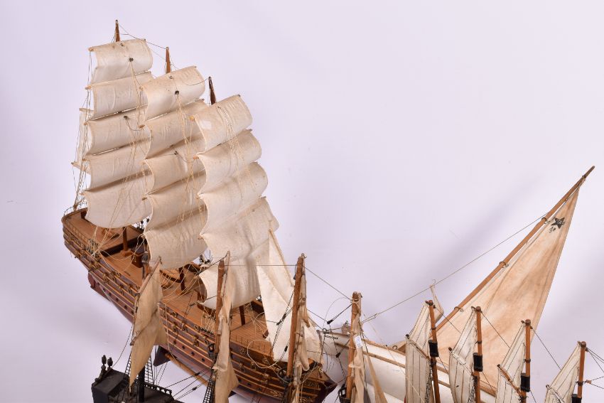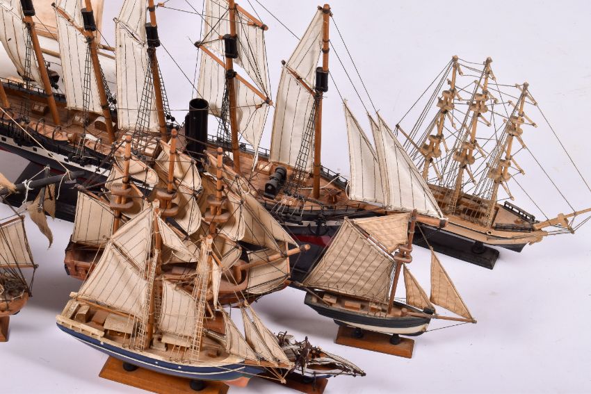 Two model galleons, a pond yacht and a SS Great Britain model long with seven smaller sail boat models. Largest L84cm x H69cm