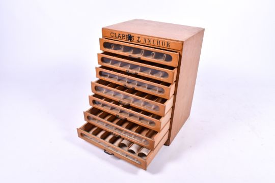 Clarks Anchor beech counter shop advertising embroidery thread display cabinet. Having seven drawers. H59cm x W44cm x D36cm