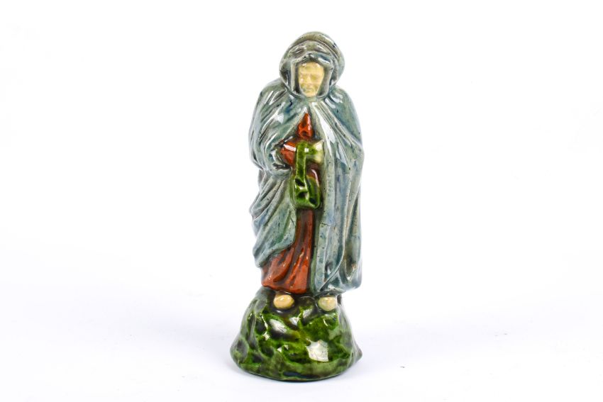 Late 19th/early 20th century Doulton style pottery figure. Modelled as a woman wearing a blue cloak. H16.5cm