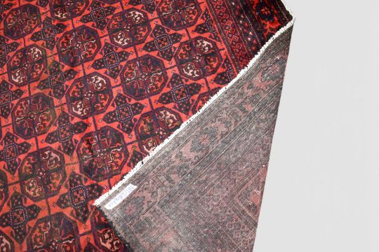 A large Afghan rug. Red groundw ith blue geometric pattern. L280cm x W223cm