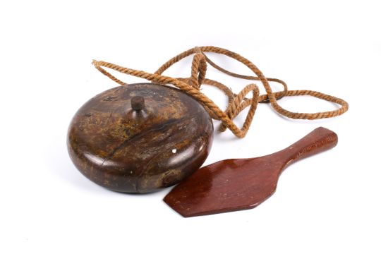 A large wooden 'gasing' or spinning top from Malaysia with rope and paddle. Diameter 23cm