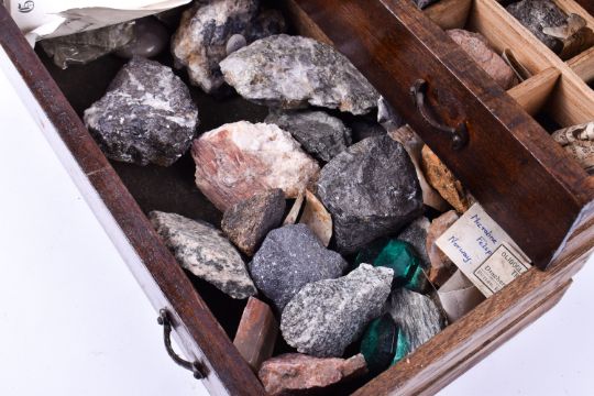 A table top geological specimen cabinet along with two framed displays. Five drawers including geological contents. Displays contain both geological and fossil specimens including ammonites and sharks teeth.