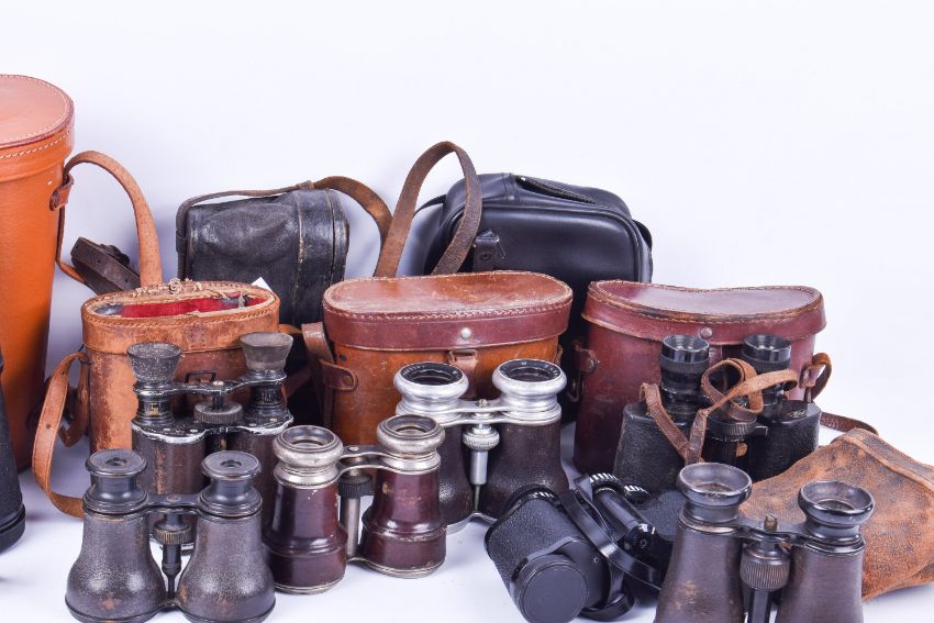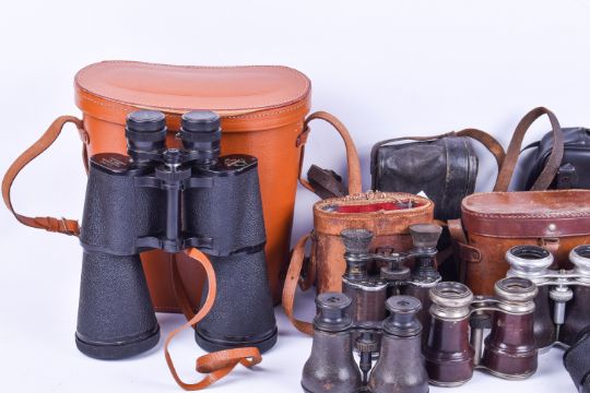 A collection of eight binoculars.Including Greenkat 12 x 60 (lens bent), Salon & Co, Trismatic x 8, W. Ecker and Halina 8 x 30. Largest 23cm long