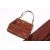 A knitted brown waistcoat, brown duster coat and a brown leather vintage handbag.