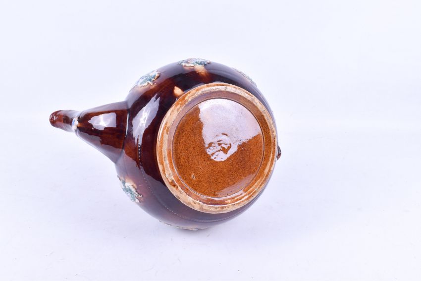 A large 'Measham' barge ware teapot (spout restored) with a teapot finial. Having brown treacle glaze with applied bird and floral decoration. H34cm