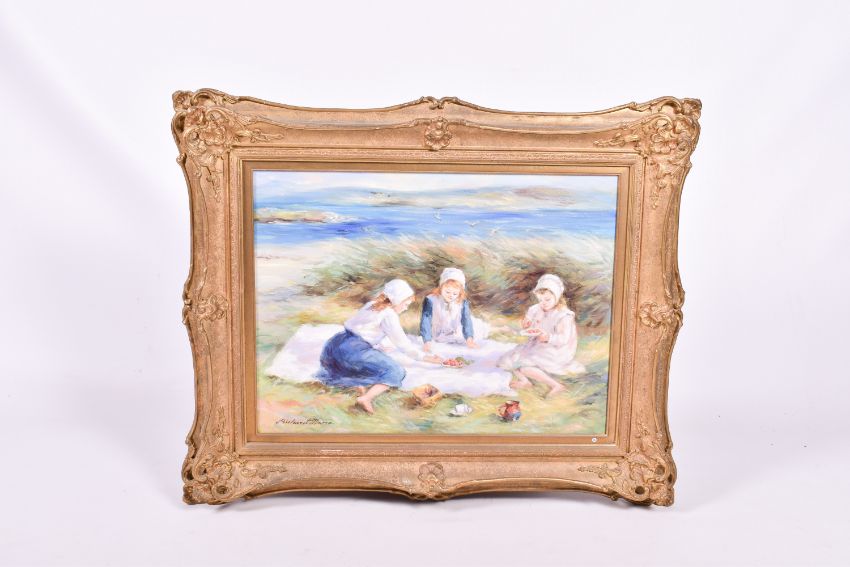 Richard Moore (20th Century) oil on canvas. Depicting three girls on a picnic by the coast, signed lower left. 58cm x 54cm. Framed 85cm x 69cm