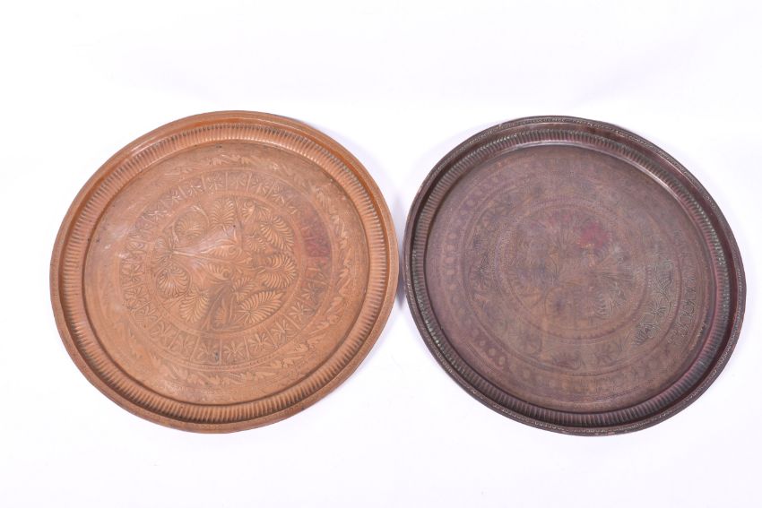 Two circular worked metal trays bought in Bangladesh. Diameter 58cm