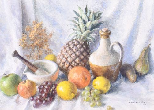 Hubert Williams (1905-1989) - two signed pastel sketches. Consisting of a still life with fruit, signed and dated 1989 lower right, 47cm x34cm and 'Innsbruck, 1966, 17cm x 24cm, both framed and glazed.