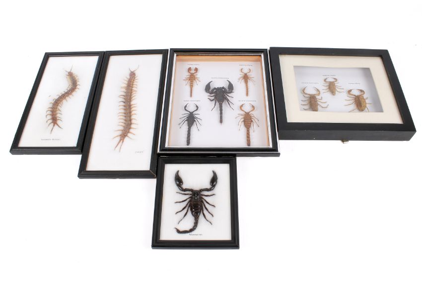 Five framed arachnid specimens. Including black scorpions (palamnaersus), centipedes, etc, longest centipede circa 22cm long.