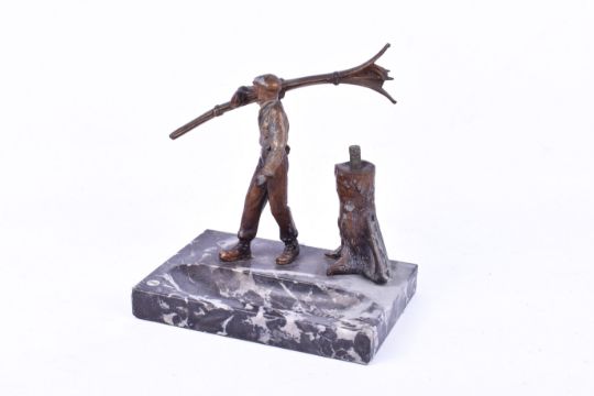 A table top lighter formed as a man carrying skis, on marble plinth. W15cm x H16cm