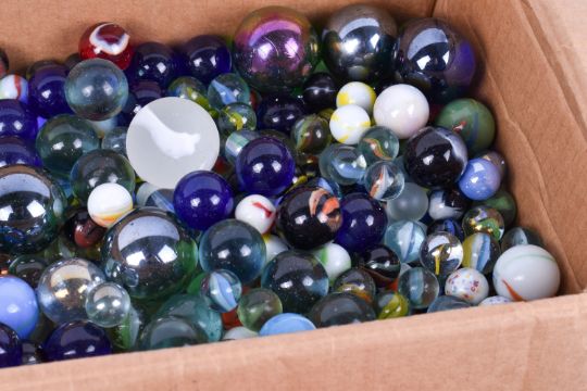 A collection of assorted glass marbles, mostly 20th century. Various sizes and colours.
