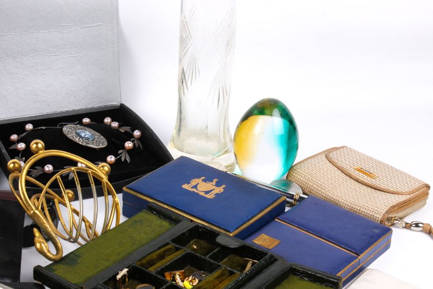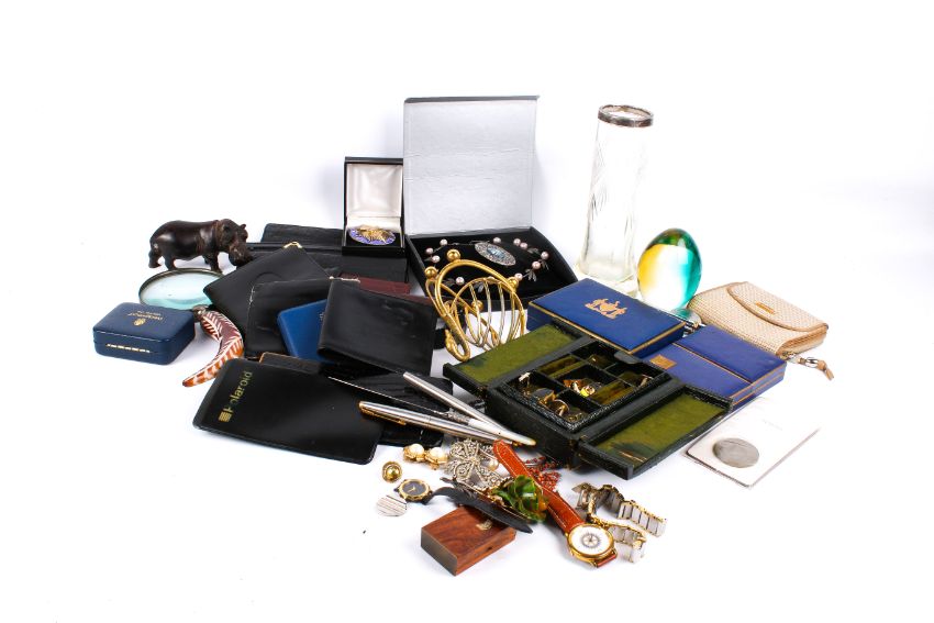 A box of assorted collectables. Including a costume jewellery, leather wallets, a silver mounted glass vase, vintage Harrods playing cards, three fountain pens by Parker and Cross , etc.