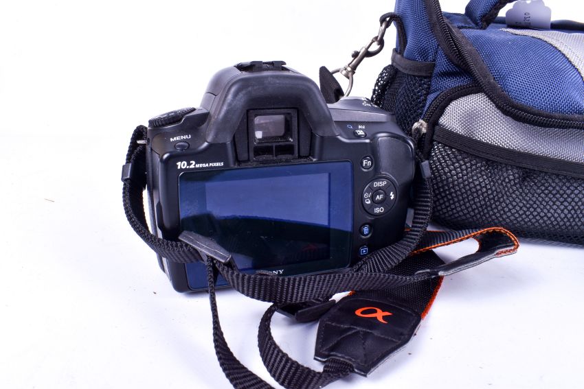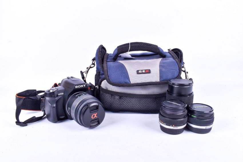 A collection of assorted cameras in a GEM bag. Including a Sony Alpha 230 digital SLR camera, three Olympus OM mount lenses, a 28mm f2.8, and a 50mm f1.8. DSLR missing charger.