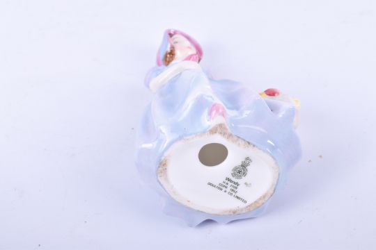 Three Doulton figures and a decorative bowl depicting flowers and butterfly. Two 'Grace' figures (HN2318) and 'Wendy' (HN2109). Largest H21cm