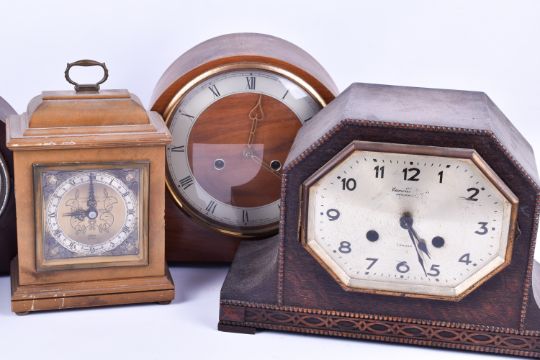 Five 20th Century mantel clocks including an oak art deco example. Largest W29cm x H24cm
