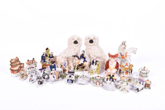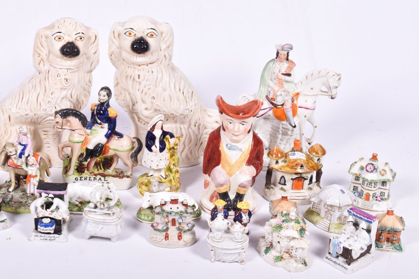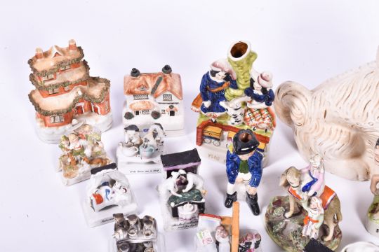 Quantity of Staffordshire pottery including comforter spaniels, figures and pastille burning cottages, plus Continental fairings.Largest H35cm