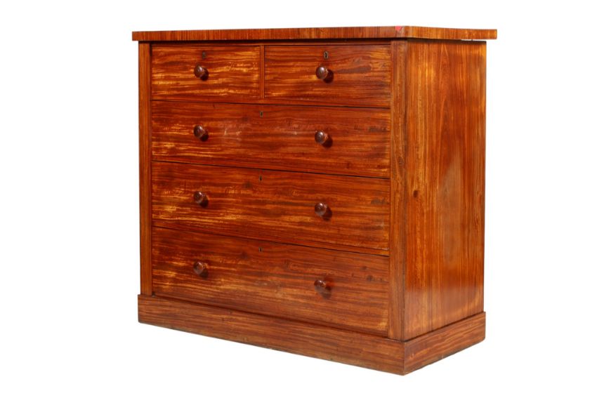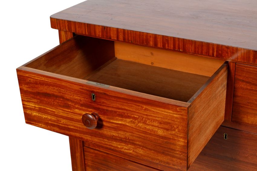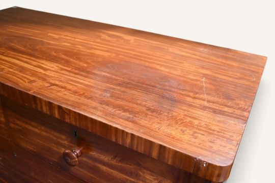 Overall in good condition. Some chips and losses to the veneer. Some small splits to the wood but no significant cracks. The top has a couple of small water marks. No signs of worm or repairs. Some general wear including light scratches and knocks consistent with age and usage. Would benefit from a clean. The interiors of the drawers are in very good condition. Structurally sound.