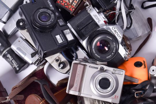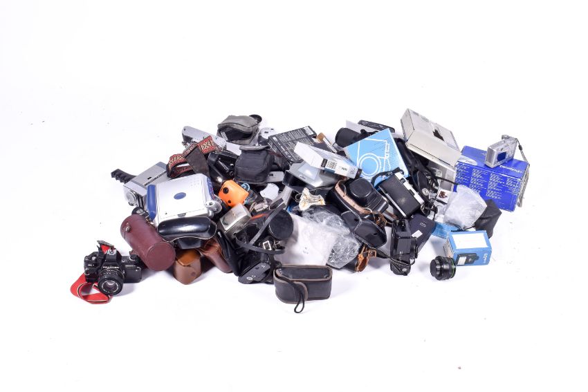Collection of assorted 35mm film and other cameras. In two boxes.