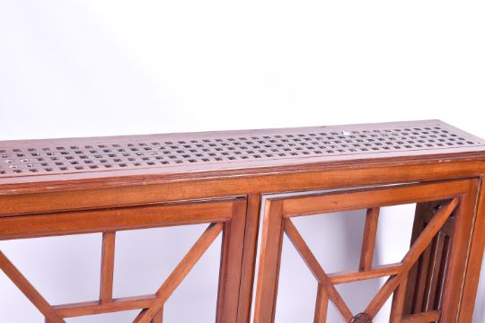 Two similar 20th century Georgian style mahogany radiator covers. Having hinged open framed doors and grill top. H89cm x W141cm x D30cm