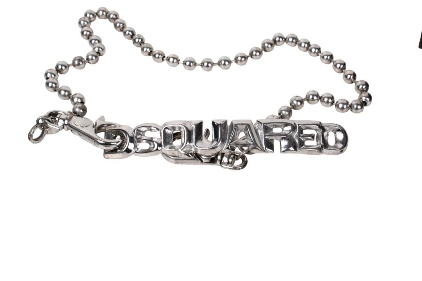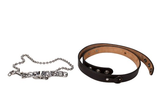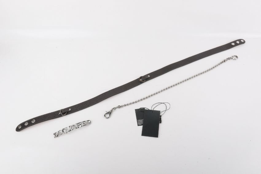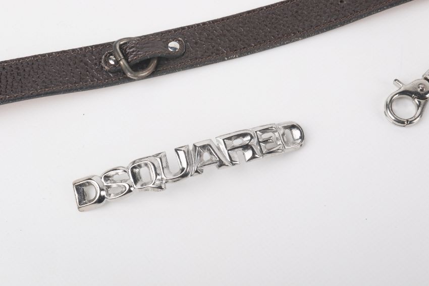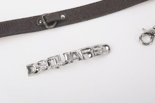 A contemporary 'DSquared2' Italian brown leather belt. Comprising a brown leather with chrome popper fastenings, chain with clips and name badge, stamped size M, length 100cm (unfastened).