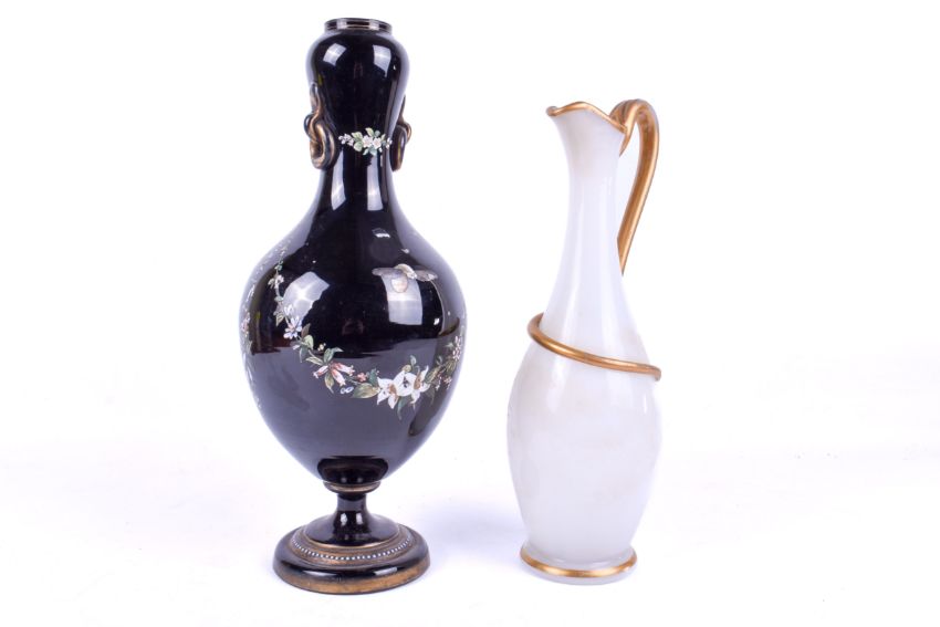Richardson of Stourbridge opaque white glass ewer and a Victorian black glass vase decorated with butterflies. Largest H36cm