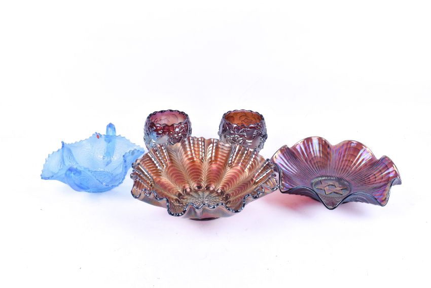 A collection of carnival glassware. Including an amethyst glass bowl with a fluted edge, an ice blue Persian medallion bon bon dish, etc. Largest H8.5cm.