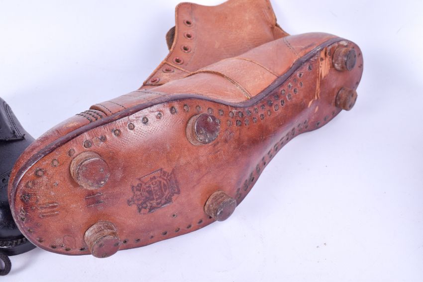 Two pairs of vintage footware. Including 'Service' football boots size 11 and a pair of childrens' Playground black leather hobnail boots size 6 or 9.
