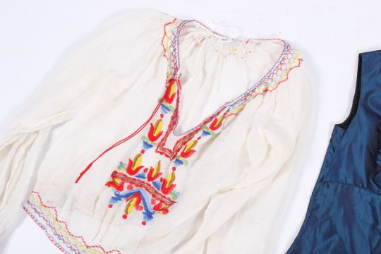 Two Dolly Rocker vintage 1960's dresses and a Hungarian blouse. Comprising a pink sleeveless dress with a ruffle collar, L95cm and a blue sleeveless dress with a ruffled hem, L97cm. The blouse having embroidered decoration around the neckline,