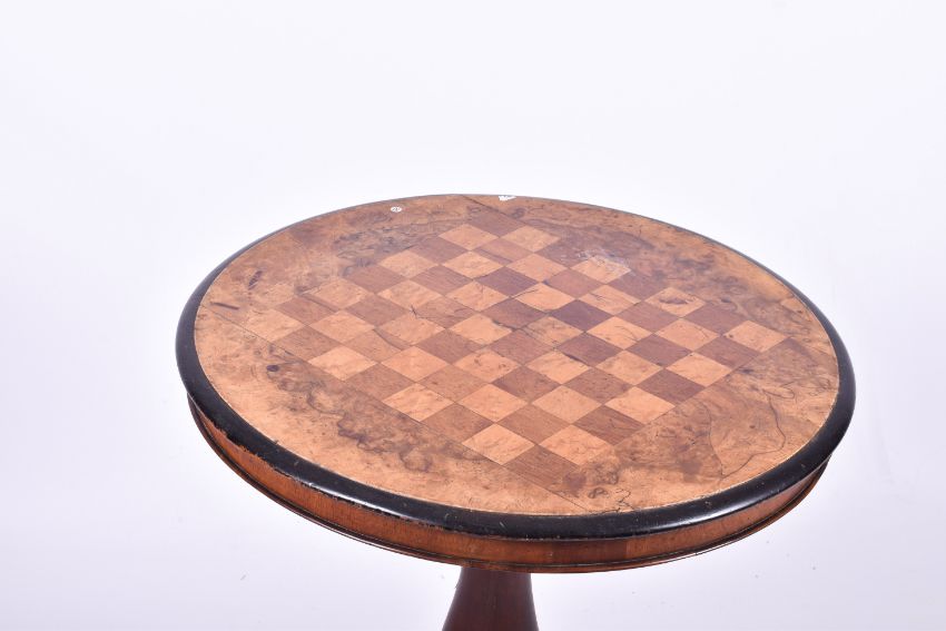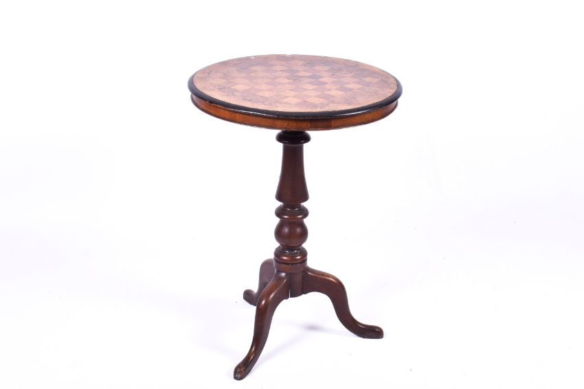 A Victorian walnut circular games table (top spilt) on tripod base. Diameter 55cm H76cm