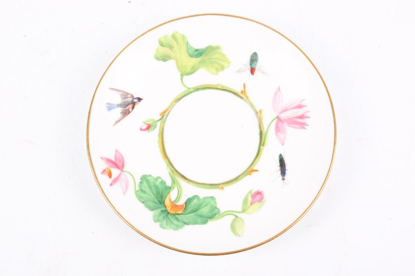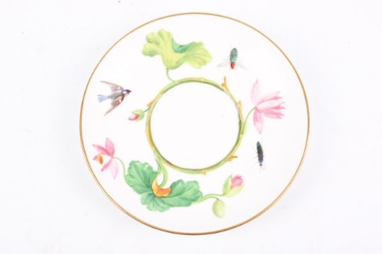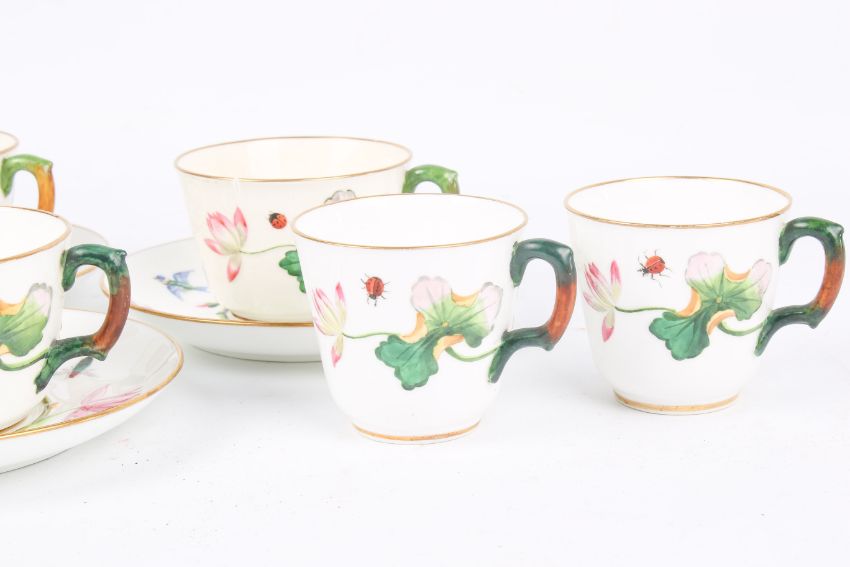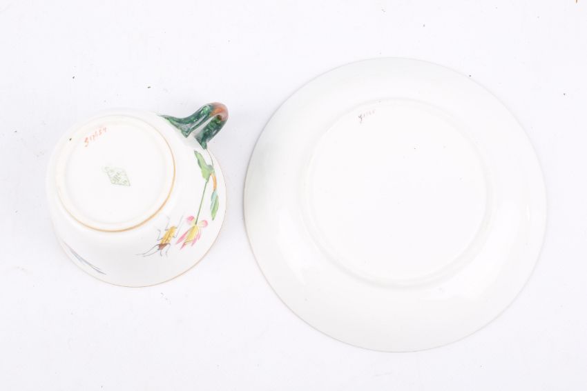 Mintons hand painted cups and saucers part set. Decorated with flowers and bugs. Saucers 14cm diameter