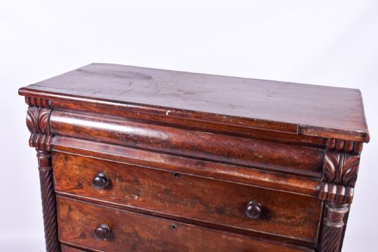 A Victorian mahogany chest of drawers. Carved top drawer front above four graduating drawers with key lock (no key). Some losses to the top front H119cm x W112cm x D51cm