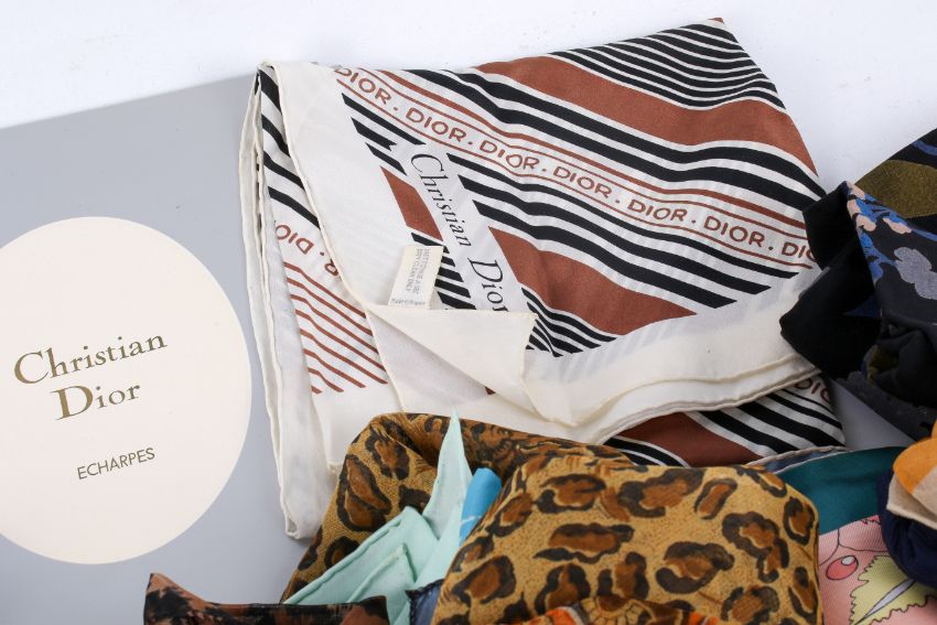 A quantity of silk and other scarves including Christian Dior. Various patterns and materials, the Christian Dior of pure silk, with brown, cream and black striped pattern, in original packaging.