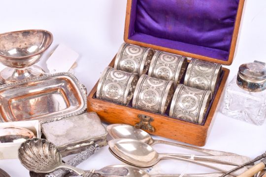 Quantity of silverplated and Sheffield plate items. Including a boxed set of six napkin rings, etc.