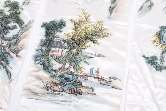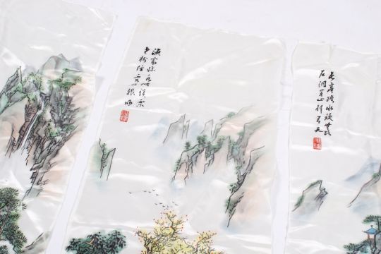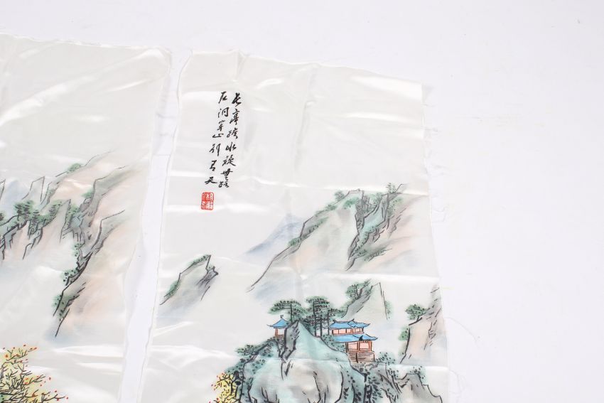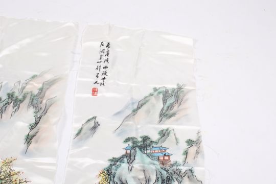 Three Chinese paintings on silk depicting rural mountain scenes with homes and river. H102cm x W38cm