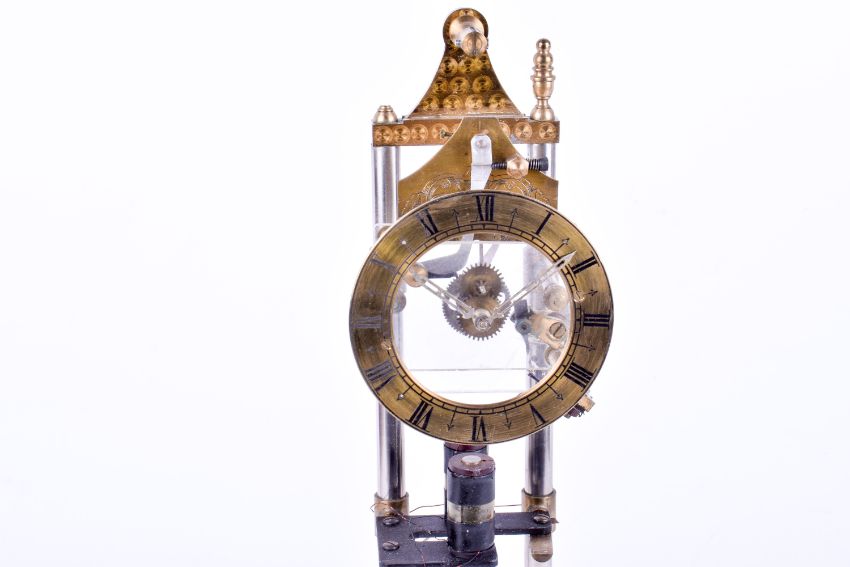 A scratch built electric 'skeleton' mantel timepiece with pendulum (af). H46cm