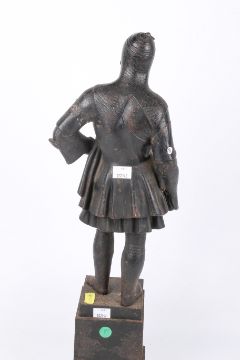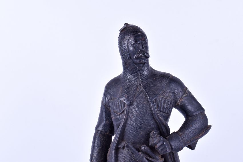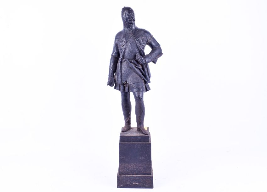 Cast iron figure of a knight wearing chainmail. Rasied on a square plinth. H60cm