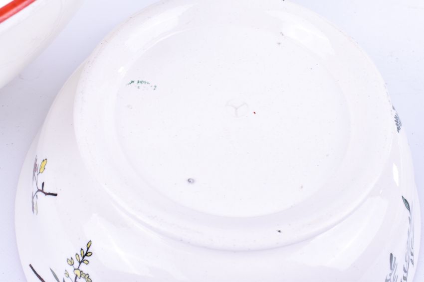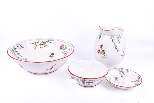 A Minton three-piece wash basin and pitcher set. Decorative branch and floral pattern. Basic H12cm x 38cm Diameter.
